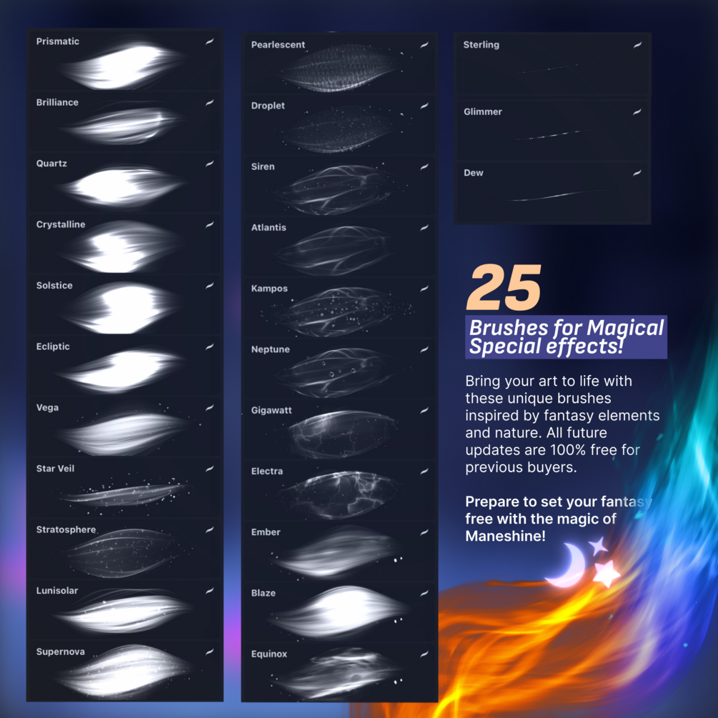 This brushpack contains a total of 25 brushes created to resemble both relastic shine textures and fantasy effects. With the high saturated shine brushes you'll never have to struggle drawing glossy highlights again because these brushes will literally do the job for you. If you wish to draw magical effects the Maneshine brushes inspired by the elements of nature will bring your art to life!