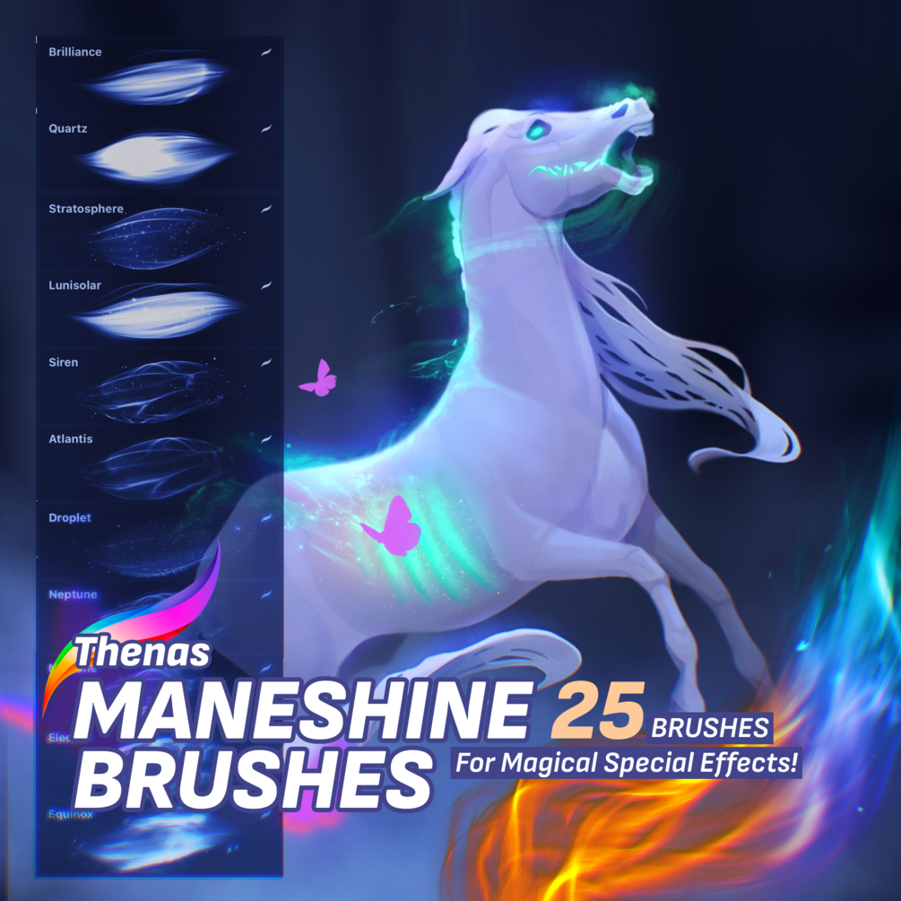 This brushpack contains a total of 25 brushes created to resemble both relastic shine textures and fantasy effects. With the high saturated shine brushes you'll never have to struggle drawing glossy highlights again because these brushes will literally do the job for you. If you wish to draw magical effects the Maneshine brushes inspired by the elements of nature will bring your art to life!