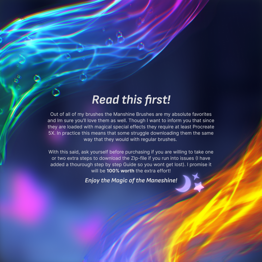 1. This Brush pack requires Procreate 5X. Make sure to have both your device and the Procreate app updated before downloading. In Procreate Pocket you need at least Version 4.0.4.